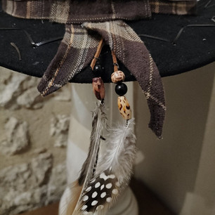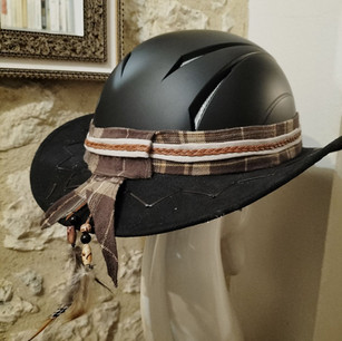 Casque Covalierro noir, chapeau noir daim, ruban en tissu à carreaux assorti au tapis western du cheval, tressage fin en cuir clair.